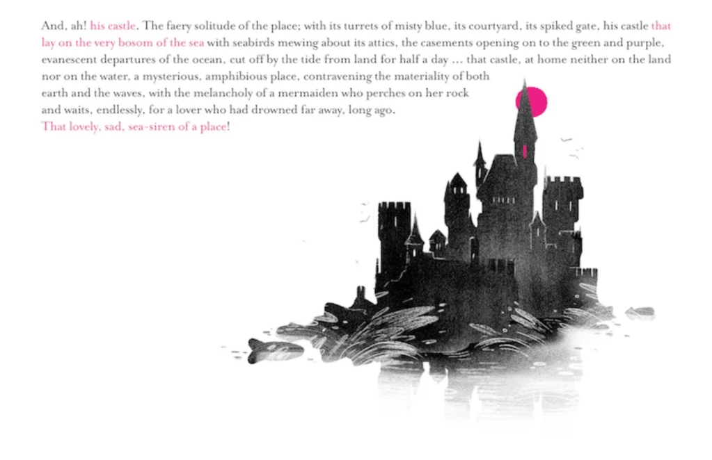 Despite her mother’s doubts about this hasty arrangement, and her nurse’s distrust of her husband’s many previous marriages, our heroine thinks nothing of her husband’s quirks and passes the night in breathless contemplation of what awaits at his residence: a magnificent castle, separated from the mainland at high tide, in which she longs to bear him a son and heir to his considerable fortune.