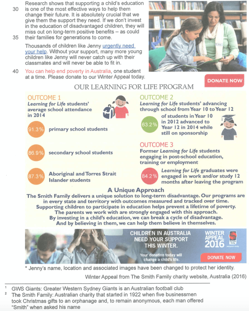 In conclusion, the text persuades the reader that, through donating to the Smith Family programme, lives of children in poverty can be improved. Through the focus on a single individual (Jenny) the issue is reduced to a manageable size for readers. The move from emotional appeal to a concrete call to action is reinforced by contrasting images showing positive outcomes. All of this is supported by authoritative language promising authenticity. Phrases like ‘research shows…’ give the claims of the appeal more credibility. Details such as ‘our programs are in every state and territory with outcomes measured and traced’ suggest organisation and effectiveness on the part of The Smith Family; they know what they are doing and your money will not be wasted or misused.
