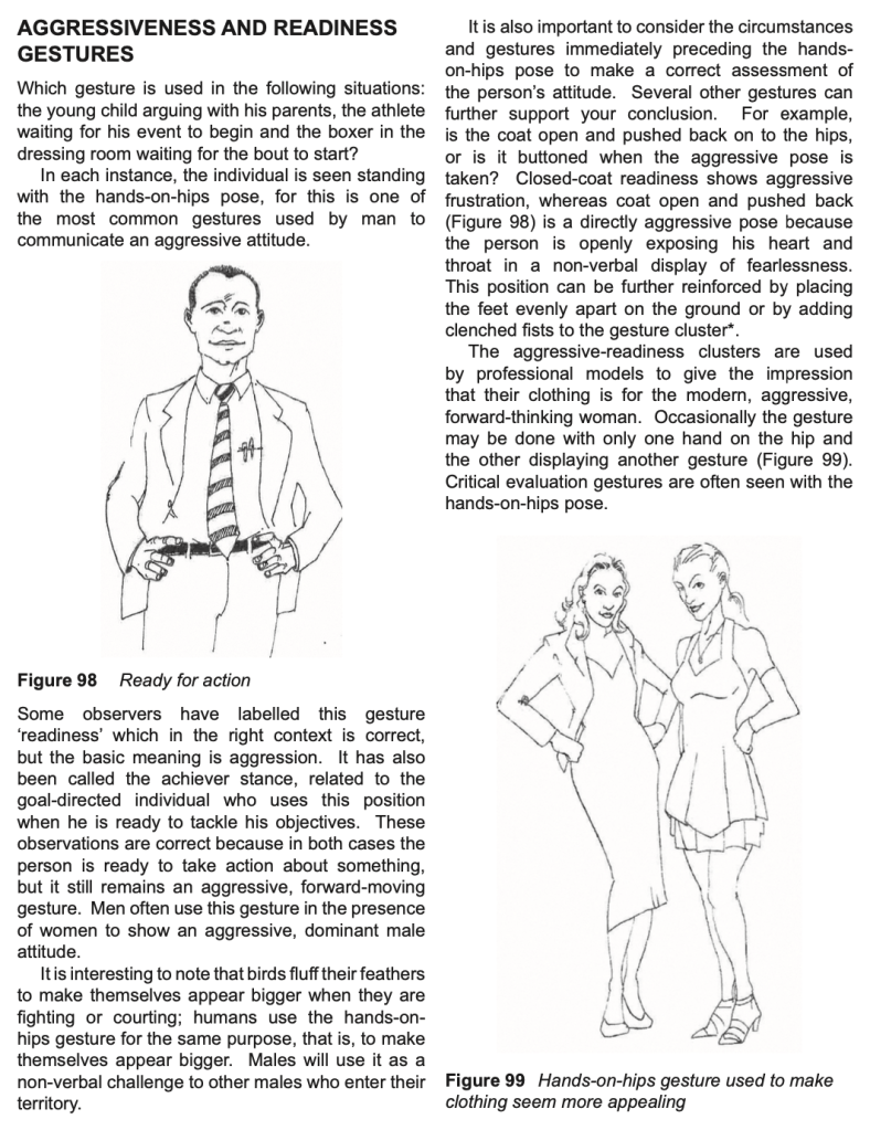 In conclusion, the purpose of the text (to educate about the importance of body language in communication) is intertwined with the values that are important to the writer. He believes that, far from being something abnormal or fearful, aggression is a natural form of human ‘readiness,’ used in everyday contexts such as sales, business negotiations, and even modelling. He conveys his meaning clearly through simple line drawings showing men and women projecting confidence and assertiveness in everyday contexts, matching the depiction of ‘readiness’ with the use of confident and assertive language, passing on his own expertise to the reader.