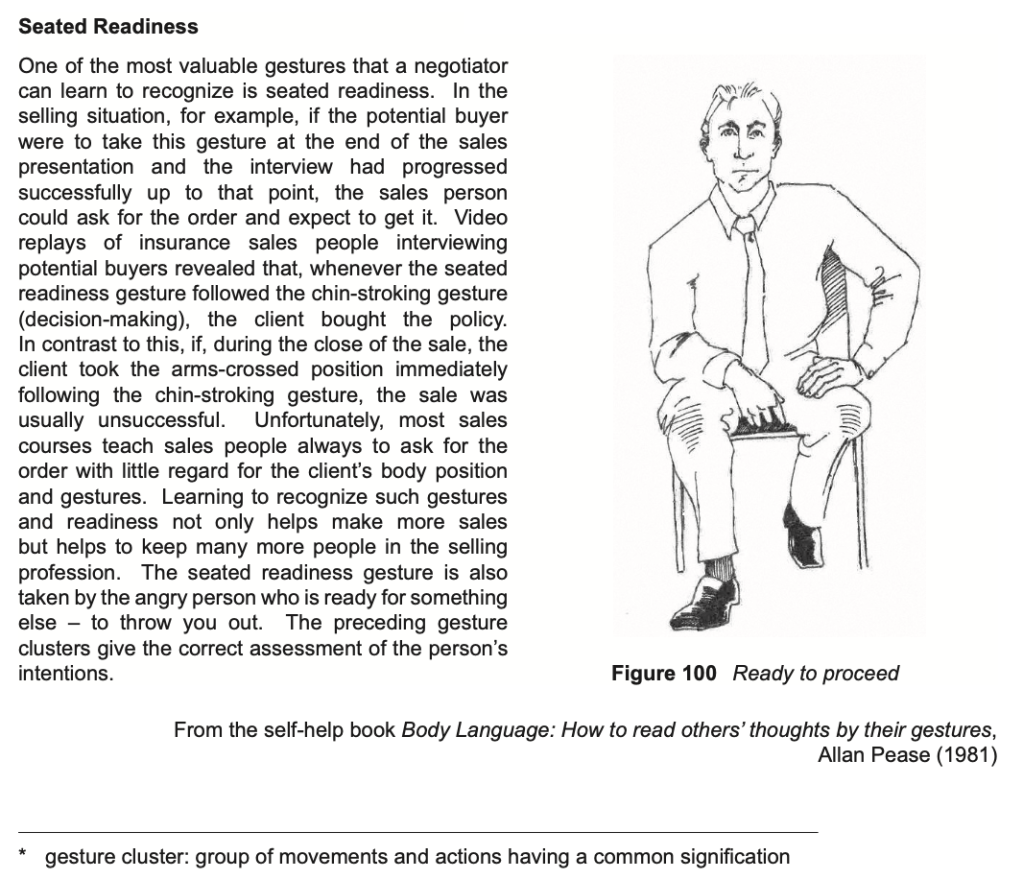 The given text is an extract from a self-help guide called Body Language: How to read others’ thoughts by their gestures, written by Alan Pease. The purpose of this extract is to educate readers about the importance of body language in conveying a person’s attitude of aggression which the writer interprets as ‘readiness’. This purpose also exposes a value that is important to the writer: rather than conveying the perception of aggression as abnormal or undesirable, he frames it as a natural human trait that is aroused in situations like sales or sport.