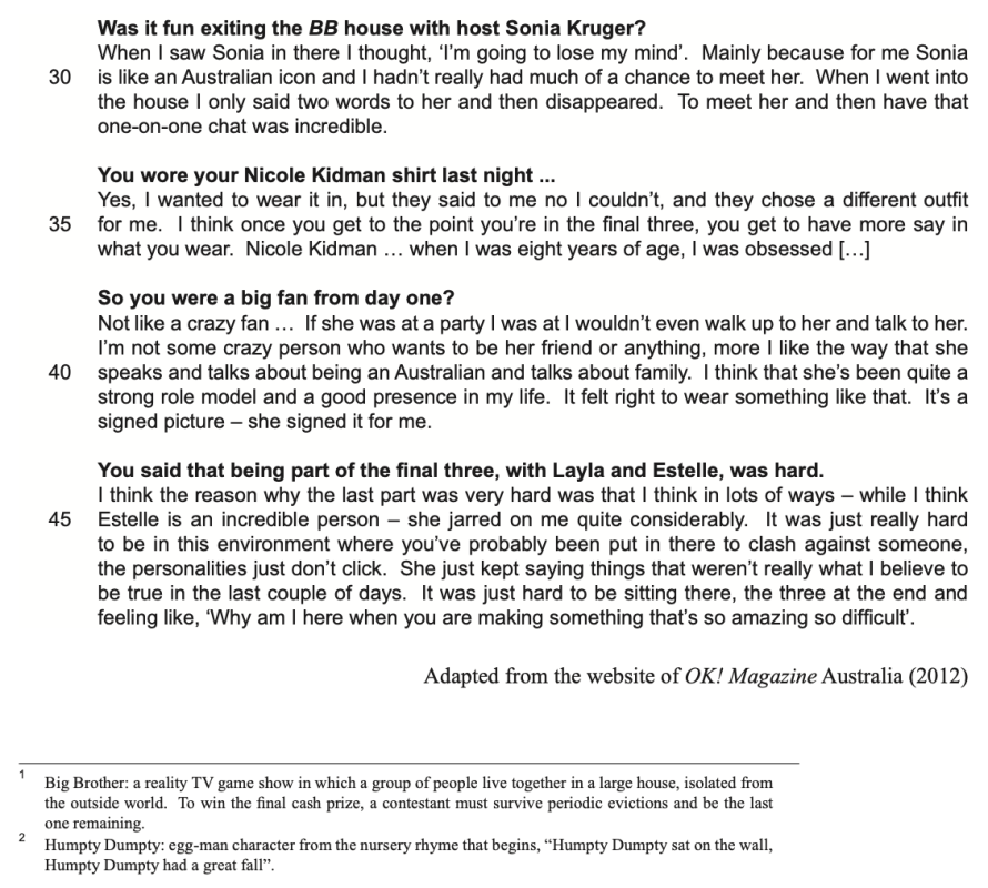 Furthermore, the text generates excitement about celebrity culture by suggesting it is participatory. While only one person – Ben – can win Big Brother, everyone can participate in their own way through, for example, wearing clothes in tribute to favourite celebrities. For this reason, the interviewer asks Ben about his Nicole Kidman t-shirt. Ben’s answers reveal how celebrity culture is an important part of his life, using words like ‘role model’, ‘family’, and ‘good presence’. These words depict celebrities as role models or guiding figures to fans. In fact, the to-and-fro over whether Ben is a ‘big fan’ and ‘not like a crazy fan‘ is revealing about how there can be a right and wrong way to participate. This is reinforced by naming conventions in the article. When Ben speaks about his fellow contestants he uses first names only (e.g. ‘Layla’ and ‘Estelle’). But when he speaks about Nicole Kidman and Sonia Kruger he uses both names. In this way, the text implies celebrity culture is something that ordinary people can be excited about participating in – but only if they don’t take it too far.