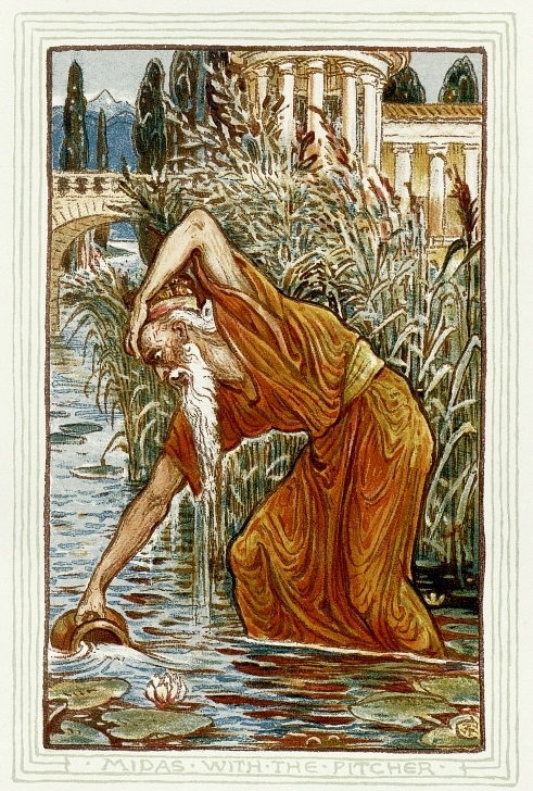 King Midas is granted one wish by the God Dionysus. Greedily, he wishes that everything he touches from now on will turn to gold. At first, Midas is delighted by his new abilities – but he soon realises that his powers come with some pretty serious drawbacks. He is unable to live anything like a normal life, as all his food, drink and loved ones turn into gold as soon as he comes into contact with them. In desperation he returns to Dionysus and pleads with him to lift the ‘curse’. Dionysus tells Midas to bathe in the river and everything will return to normal.