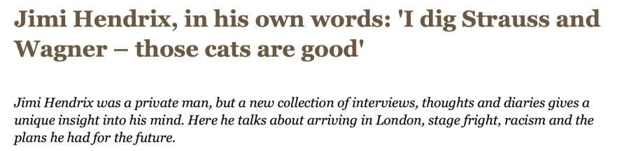 The first noticeable thing about this interview is the unusual format. Typically, written interviews are published in a question-and-answer format, with the opinions of the interviewee being guided and led by the interviewer. However, apart from the subheading and caption, the only voice that appears in this interview is that of Hendrix. This creates a text more like a diary than an interview, with the reader getting the feeling they are drawn into his private thoughts. The heading explicitly calls attention to this feature, stating the interview is all ‘in his own words’. The writer doesn’t intrude, so the text unfolds quite naturally, shifting from topic-to-topic in the manner of an easy and relaxed stream-of-consciousness, rather than a formal interview. As well as embodying the way thoughts and ideas jump and flow naturally, the format allows the reader to imagine being inside Hendrix’s mind, escape from reality and delve into his ‘thoughts’. Being the recorded words of someone from the past, the text also opens up a bridge between the living and the dead, creating a whole new type of ‘them-and-us’ dichotomy.