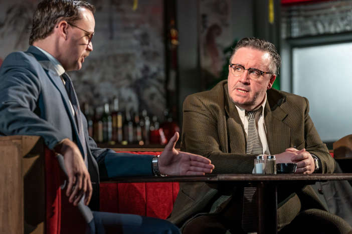 Act 1 is structured like a triptych: the action all takes place in the same Chinese restaurant, with each pair of men seated in separate booths, and is structured in three scenes that mirror each other. In the first duologue, scene 1, two men are engaged in a heated discussion related to real estate sales goals. Shelly Levene, an old salesman, is having a run of bad luck and is trying to convince the real estate office manager, a younger man named John Williamson, to help him by sending a few good sales leads his way. The sense of panic and frustration are almost palpable as Levene comes as close as his dignity will allow to begging for his job from someone who has never actually sold anything in his life. Levene’s outrage is directed at more than the office manager – he’s frustrated with how life seems to be pushing him aside for younger men with more vitality and effectiveness.