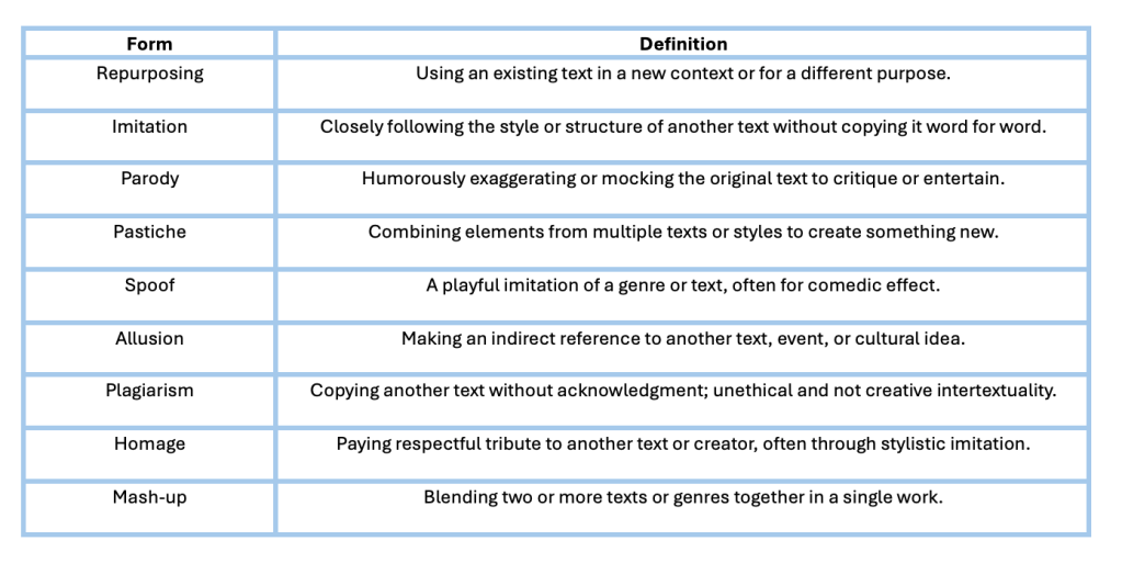 Intertextuality can take many forms. It may appear as direct quotation, where words from another text are used verbatim, or as allusion, where a writer indirectly refers to a well-known work, event, or figure. Other forms include parody, which humorously imitates a text to critique or entertain, and pastiche, which blends styles from multiple sources. Adaptations, such as films based on novels or retellings of myths in modern settings, are also examples of intertextuality at work.