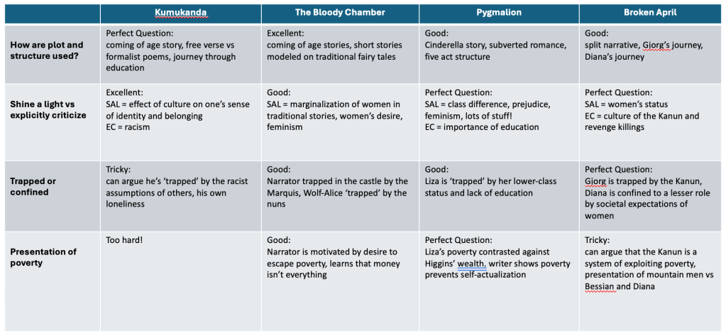 Use the image above to create your own survey grid using the works you’ve studied and apply the same rating system to four questions you might encounter on Paper 2. This process will help you think critically about question focuses, whether it’s themes, characters, writer’s methods, reader interpretations, or a mix, and prepare you to make the best choice for you on the day of the exam.