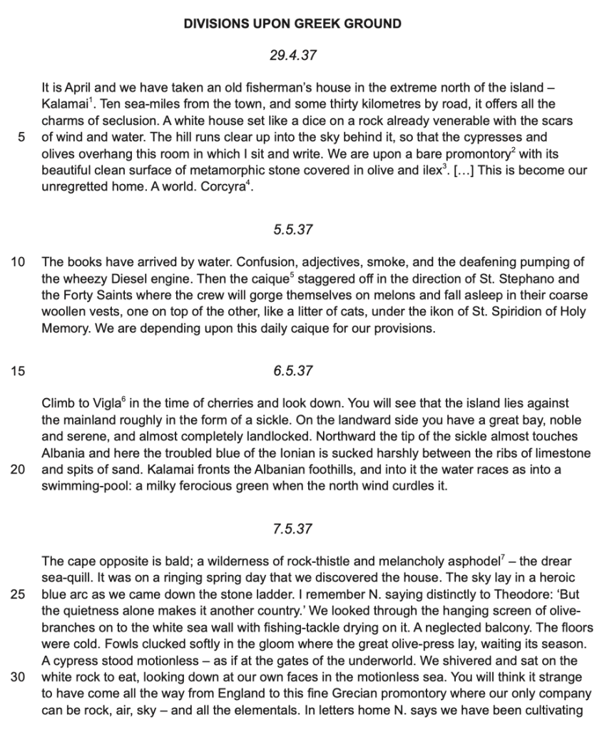 The given extract depicts the author Lawrence Durrell’s arrival on a Greek island in excerpts from his travel diary. Through use of descriptive language techniques ranging from similes and personification to imagery and contrast, the author creates a secluded and lonely atmosphere, but also one that’s charming and refreshing. The contrast between the grandiosity of nature and the minuteness of individuals establishes the island as a place that could be overwhelming for humans, but, through bonding with nature and paying attention to life, the writer sees it as a place where he can gain fresh insights so that a ‘book can grow’ from the seemingly bare rocky landscape.
