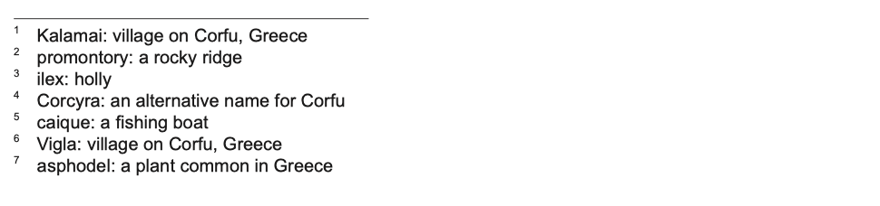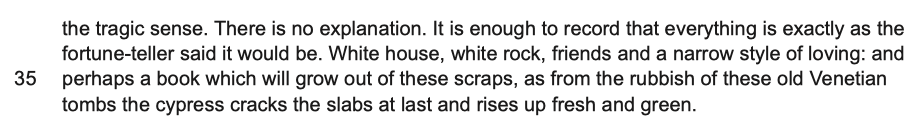 Overall, the writer creates a complex and nuanced atmosphere that implies both hardship and abundance at the same time. The foundations of the island are bare, barren and lonely, and it is this seclusion from the comforts and distractions of the human world that the writer is seeking. However, overlaid on the rocky surface are images of growth and the abundance of nature that correlates with the writer’s imagination. In coming to this island, he hopes to write a book that will ‘grow out of these scraps, as… the cypress cracks the slabs and rises up fresh and green.’